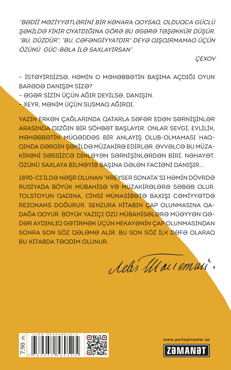 1890-cı ildə nəşr olunan “Kreyser sonatası” həmin dövrdə Rusiyada böyük mübahisə və müzakirələrə səbəb olur. Tolstoyun qadına, cinsi münasibətə baxışı cəmiyyətdə rezonans doğurur. Senzura kitabın çap olunmasına qadağa qoyur. Böyük yazıçı özü mübahisələrə müəyyən qədər aydınlıq gətirmək üçün hekayənin çap olunmasından sonra son söz qələmə alır. Həmin son söz ilk dəfə olaraq kitabın bu nəşrində təqdim olunur.