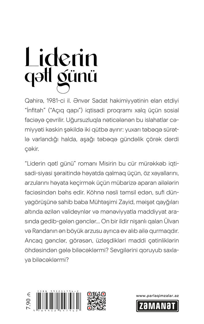 “Liderin qətl günü” romanı Misirin bu cür mürəkkəb iqtisadi-siyasi şəraitində həyatda qalmaq üçün, öz xəyallarını, arzularını həyata keçirmək üçün mübarizə aparan ailələrin faciəsindən bəhs edir. Köhnə nəsli təmsil edən, sufi dünyagörüşünə sahib baba Mühtəşimi Zayid, məişət qayğıları altında əzilən valideynlər və mənəviyyatla maddiyyat arasında gedib-gələn gənclər... On bir ildir nişanlı qalan Ülvan və Randanın ən böyük arzusu ayrıca ev alıb ailə qurmaqdır. Ancaq gənclər, görəsən, üzləşdikləri maddi çətinliklərin öhdəsindən gələ biləcəklərmi? Sevgilərini qoruyub saxlaya biləcəklərmi?