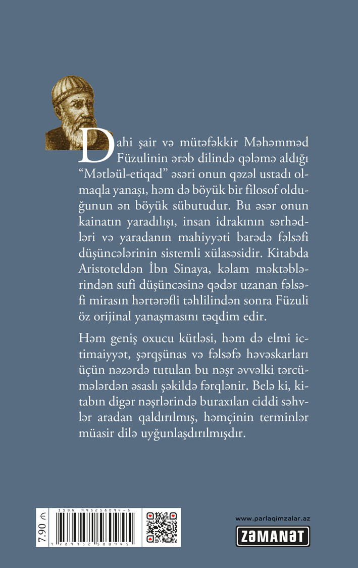 Dahi şair və mütəfəkkir Məhəmməd Füzulinin ərəb dilində qələmə aldığı “Mətləül-etiqad” əsəri onun qəzəl ustadı olmaqla yanaşı, həm də böyük bir filosof olduğunun ən böyük sübutudur. Bu əsər onun kainatın yaradılışı, insan idrakının sərhədləri və yaradanın mahiyyəti barədə fəlsəfi düşüncələrinin sistemli xülasəsidir. Kitabda Aristoteldən İbn Sinaya, kəlam məktəblərindən sufi düşüncəsinə qədər uzanan fəlsəfi mirasın hərtərəfli təhlilindən sonra Füzuli öz orijinal yanaşmasını təqdim edir.