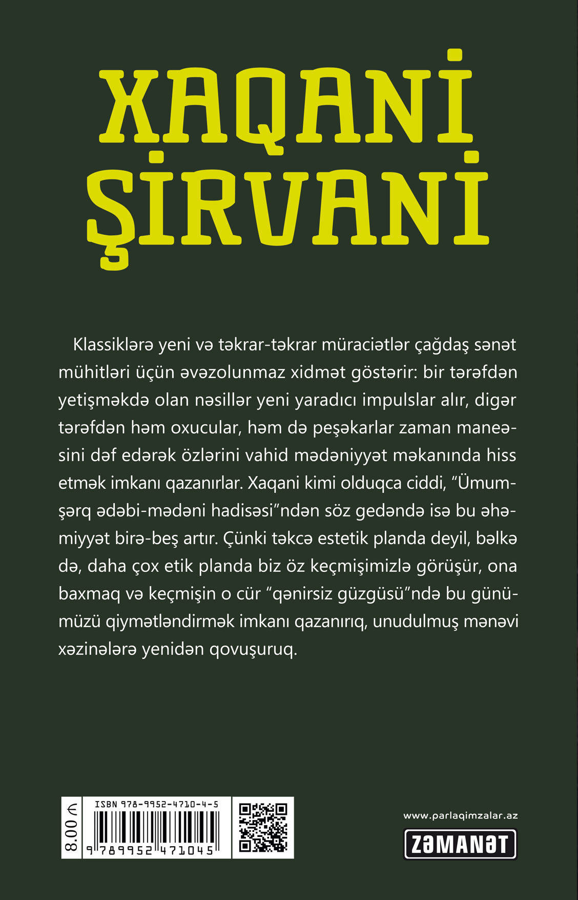 Klassiklərə yeni və təkrar-təkrar müraciətlər çağdaş sənət mühitləri üçün əvəzolunmaz xidmət göstərir: bir tərəfdən yetişməkdə olan nəsillər yeni yaradıcı impulslar alır, digər tərəfdən həm oxucular, həm də peşəkarlar zaman maneəsini dəf edərək özlərini vahid mədəniyyət məkanında hiss etmək imkanı qazanırlar. Xaqani kimi olduqca ciddi, “Ümumşərq ədəbi-mədəni hadisəsi”ndən söz gedəndə isə bu əhəmiyyət birə-beş artır. Çünki təkcə estetik planda deyil, bəlkə də, daha çox etik planda biz öz keçmişimizlə görüşür, ona baxmaq və keçmişin o cür “qənirsiz güzgüsü”ndə bu günümüzü qiymətləndirmək imkanı qazanırıq, unudulmuş mənəvi xəzinələrə yenidən qovuşuruq.