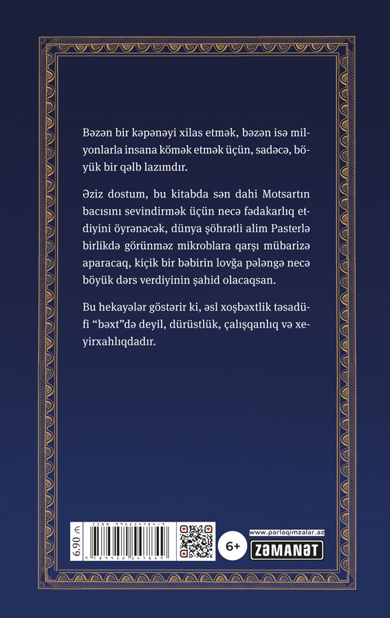 Əziz dostum, bu kitabda sən dahi Motsartın bacısını sevindirmək üçün necə fədakarlıq etdiyini öyrənəcək, dünya şöhrətli alim Pasterlə birlikdə görünməz mikroblara qarşı mübarizə aparacaq, kiçik bir bəbirin lovğa pələngə necə böyük dərs verdiyinin şahid olacaqsan.